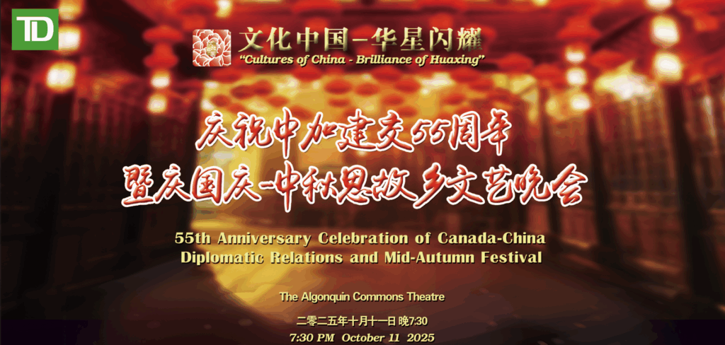 10月11日,渥太华华星艺术团联合渥太华中华会馆、渥太华洪门、东安省台山同乡会、渥太华潮州会、渥太华中国校友会、渥太华北京协会、阿岗昆学院校友会等30多家华人社团共同举办“四海同春-华星闪耀-庆祝中加建交55周年暨庆祝中华人民共和国成立76周年 中秋思故乡文艺晚会”。本次晚会的主旨是促进中加民间文化交流、祝福祖(籍)国繁荣昌盛、寄托海外华人华侨的思乡之情。