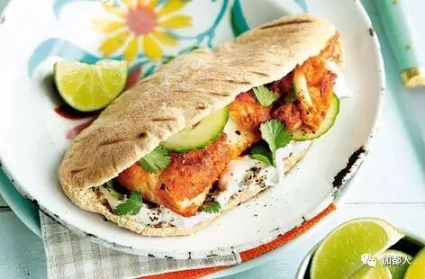 烤鱼片是超市买回来的半成品,先放进烤箱两面共烤20分钟; 生菜、西红柿洗净滤去水分,因为要保存到中午才吃,为了不影响Pita的口感,俺还是用纸巾认真吸干菜叶上的水珠,把材料铺在Pita上一卷就行了,可以加一些cheese,味道更好。