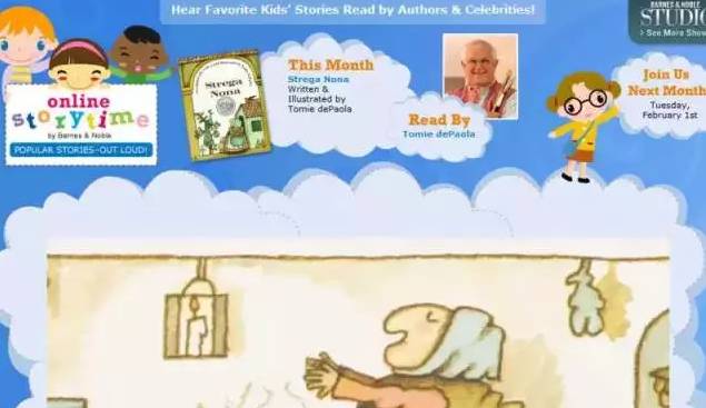 Barnes and Noble(巴诺书店)是美国最大的零售连锁书店,他们的网站也提供很多童书资源,其中Online Storytime里都是可以免费在线听的有声书,包括很多大家熟知或得奖的绘本。这里的有声书都是作者原声讲读的,孩子听了会很有感染力的哦~