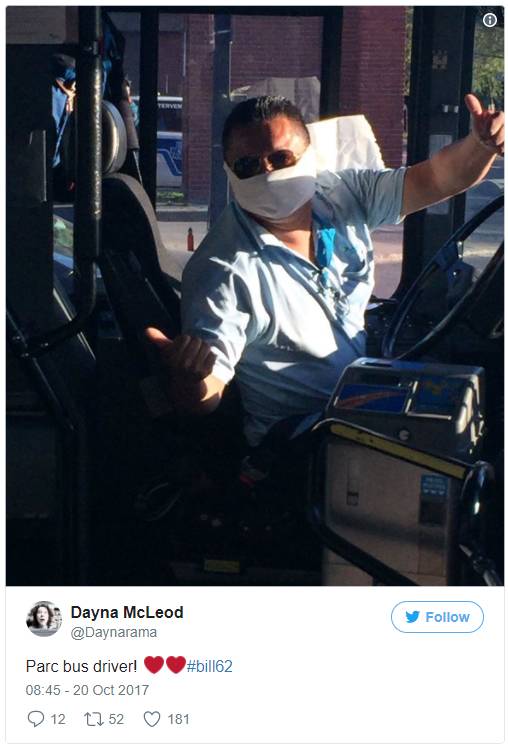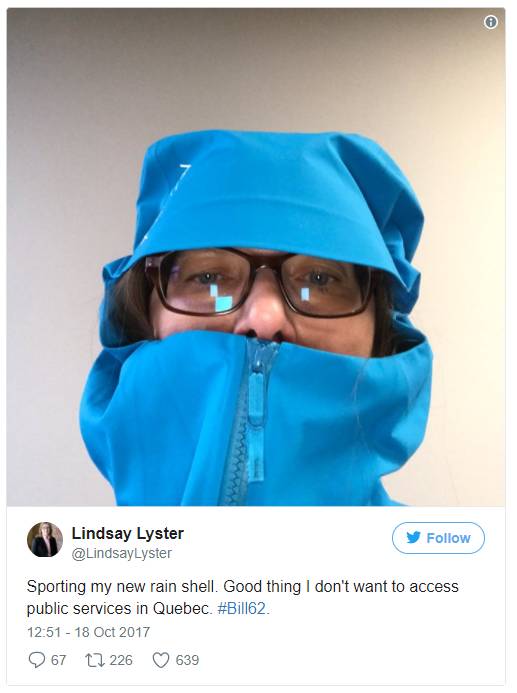 该法律已于星期三当日生效。按照该法案,在魁北克,提供及接受公共服务的人士,展露的公众外表必须是“宗教中立”的。普遍认为该法案是针对穆斯林妇女穿戴的罩袍及只露双眼的面纱。该法案的执行,可能导致这样穿着的人士甚至不能搭乘公共交通。