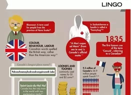 20、加拿大人讲的是美式英语,但拼写是英式的。比如Colour, Labour,Behaviour.(记得有人和我说过,应该把Center拼成Centre的。)