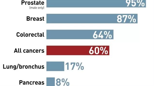 近年来,癌症患者生存率大增。比如,在加拿大,前列腺癌的5年生存率已经高达 95%,乳腺癌高达 87%,结肠直肠癌患者的5年生存率为 64%。