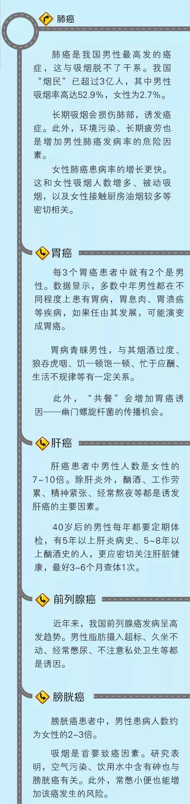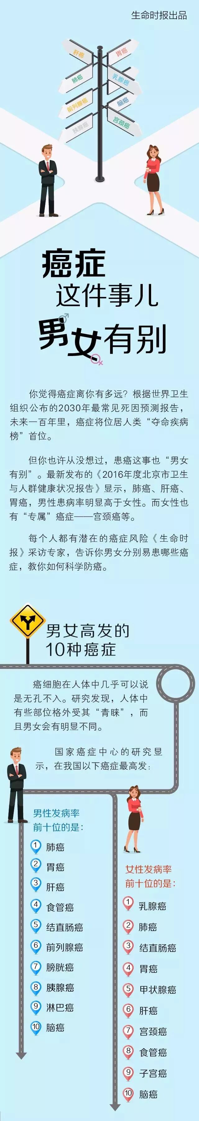 下面内容小编摘自“生命时报”,用一张图告诉你男女性高发的癌症分别有哪几种,如何从生活习惯入手,科学预防癌症。