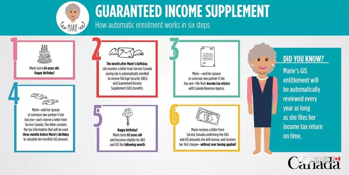 这是一项针对于65岁以上老人的福利。联邦政府1月9日宣布:自今年1月1日起,把年龄64岁及以上符合资格的长者,自动纳入“长者收入保证补助金(Guaranteed Income Supplement,简称GIS)”之列。