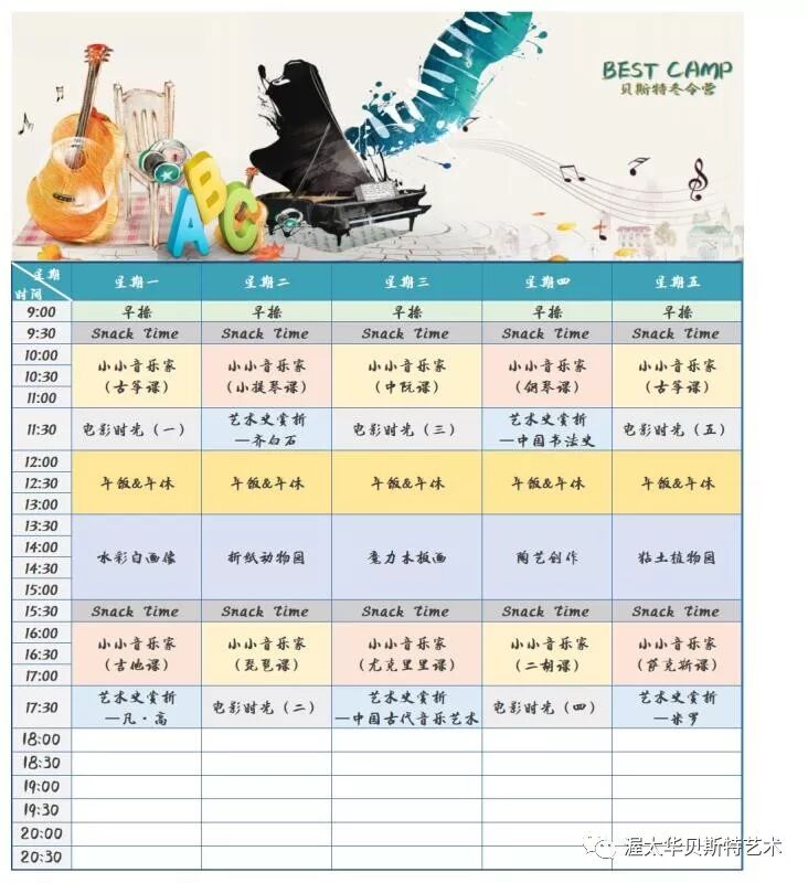 五天的贝思特小艺术家春令营,您的孩子将会有小小音乐家课程、小小美术家课程、艺术史赏析课程以及电影赏析课程。课程寓乐于教,主要针对于培养孩子们的艺术兴趣和细胞。在小小音乐家课程当中,孩子们将会接触和学习演奏各式中西乐器包括古筝、吉他、小提琴、琵琶、中阮、尤克里里、钢琴、二胡以及萨克斯。在小小美术家课程。孩子们将会学习水彩、折纸、木板画、陶艺和粘土。更多课程详情和安排,请点击下图春令营课程安排表: