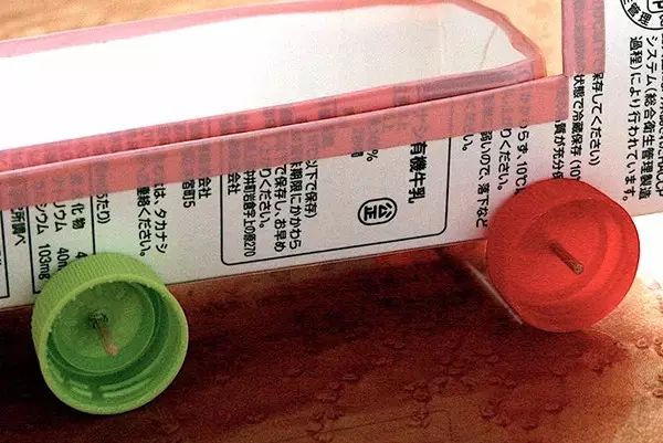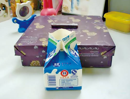 准备牛奶盒、竹签或吸管、塑料瓶盖