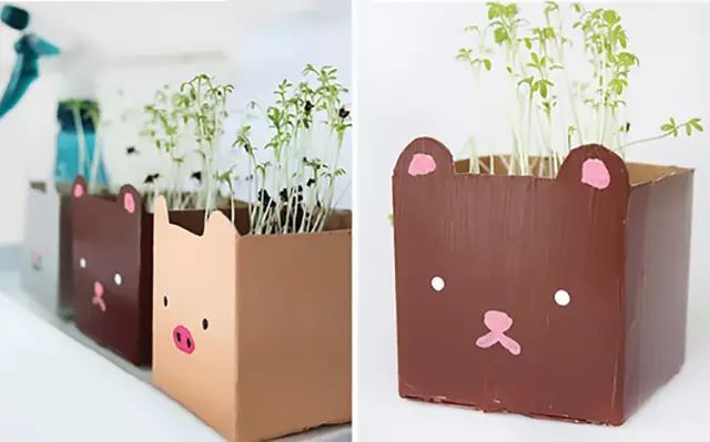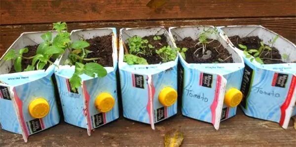 回归原始创意,牛奶盒直接当作花盆,放在室外也很不错