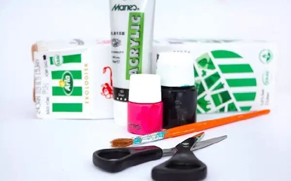 准备牛奶盒、丙烯颜料、剪刀、刷子