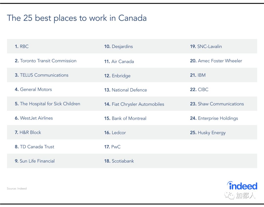 历过毕业季的同学们是否已经找到自己梦寐以求的工作?已经找到工作的或者正在上班的朋友们是否想知道自己的单位有多厉害?那么今天的文章将会带你看一看Indeed网站下,六十万会员所选出来的,加拿大最好的二十五家公司(Best Employer)。
