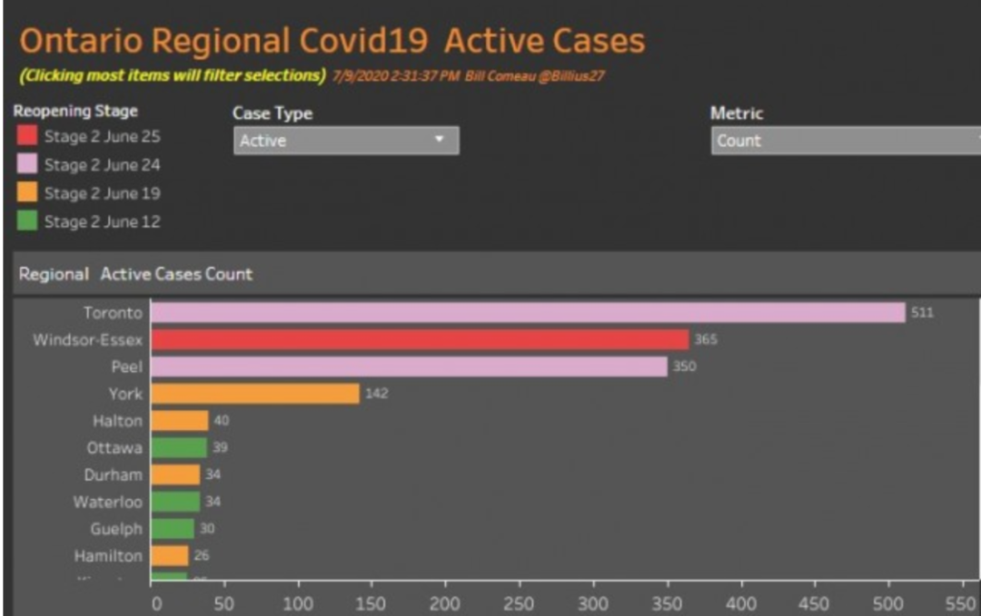 最近以来,现存病例的排序一直是多伦多第一、皮尔区第二,温莎-埃塞克斯地区第三。但因温莎地区外劳感染病例再度突增,令其超过皮尔区,排在多伦多之后居第二